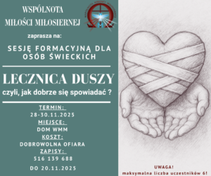 Tym razem przygotowaliśmy SESJĘ FORMACYJNĄ DLA OSÓB ŚWIECKICH ! Jest to weekendowy czas skupienia dla tych, którzy chcą pogłębić rozumienie i przezywanie Sakramentu Pokuty, który głęboko przeżywany jest Sakramentem Uzdrowienia duszy i ciała. Termin: 28-30.11.25 w Domu WMM w Polańczyku Maksymalna liczba uczestników- 6. Start 28.11 o godz. 17, zakończenie 30.11 ok godz.13. Obowiązują wcześniejsze […]