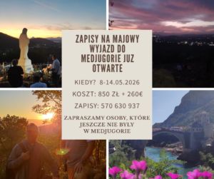 Wspólnota Miłości Miłosiernej organizuje wyjazd do Medjugorie 8-14 maj 2026, wyjazd organizowany dla tych, którzy jeszcze nie mieli okazji być w tym szczególnym miejscu. Koszt: 850 zł i 260 € zapisy pod numerem tel: 570 630 937