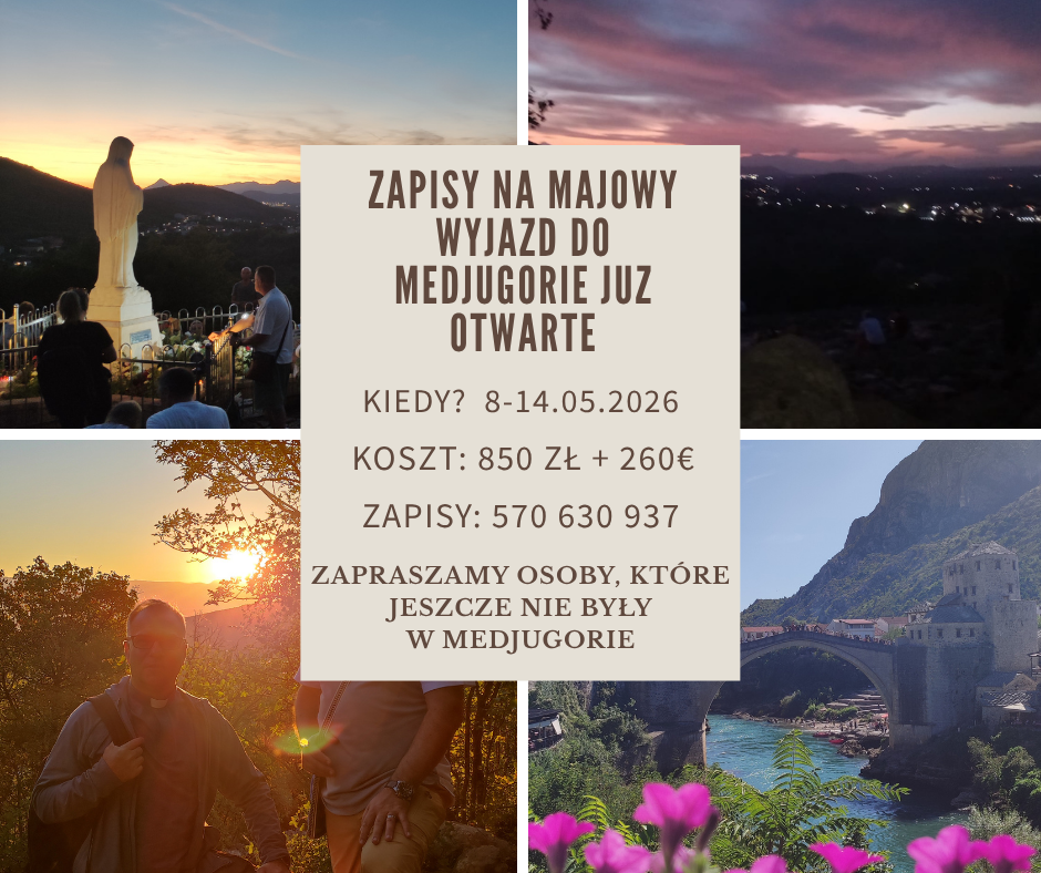 Wspólnota Miłości Miłosiernej organizuje wyjazd do Medjugorie 8-14 maj 2026, wyjazd organizowany dla tych, którzy jeszcze nie mieli okazji być w tym szczególnym miejscu.Koszt: 850 zł i 260 € zapisy pod numerem tel: 570 630 937