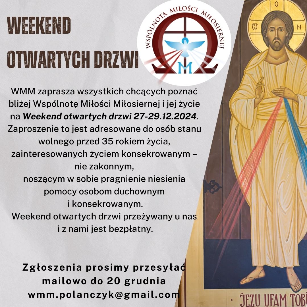 Weekend otwartych drzwi WMM zaprasza wszystkich chcących poznać bliżej Wspólnotę Miłości Miłosiernej i jej życie na Weekend otwartych drzwi 27-29.12.2024. Zaproszenie to jest adresowane do osób stanu wolnego … Czytaj dalej