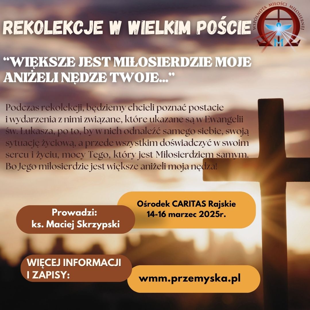 Plan rekolekcji Rajskie 14-16 marzec 2025r. Prowadzący: ks. Maciej Skrzypski Większe jest miłosierdzie Moje aniżeli nędze twoje…(Dz. 1485). Piątek 16:00 Recepcja 17:45 Spotkanie wprowadzające ( sala na I piętrze) 18:00 … Czytaj dalej
