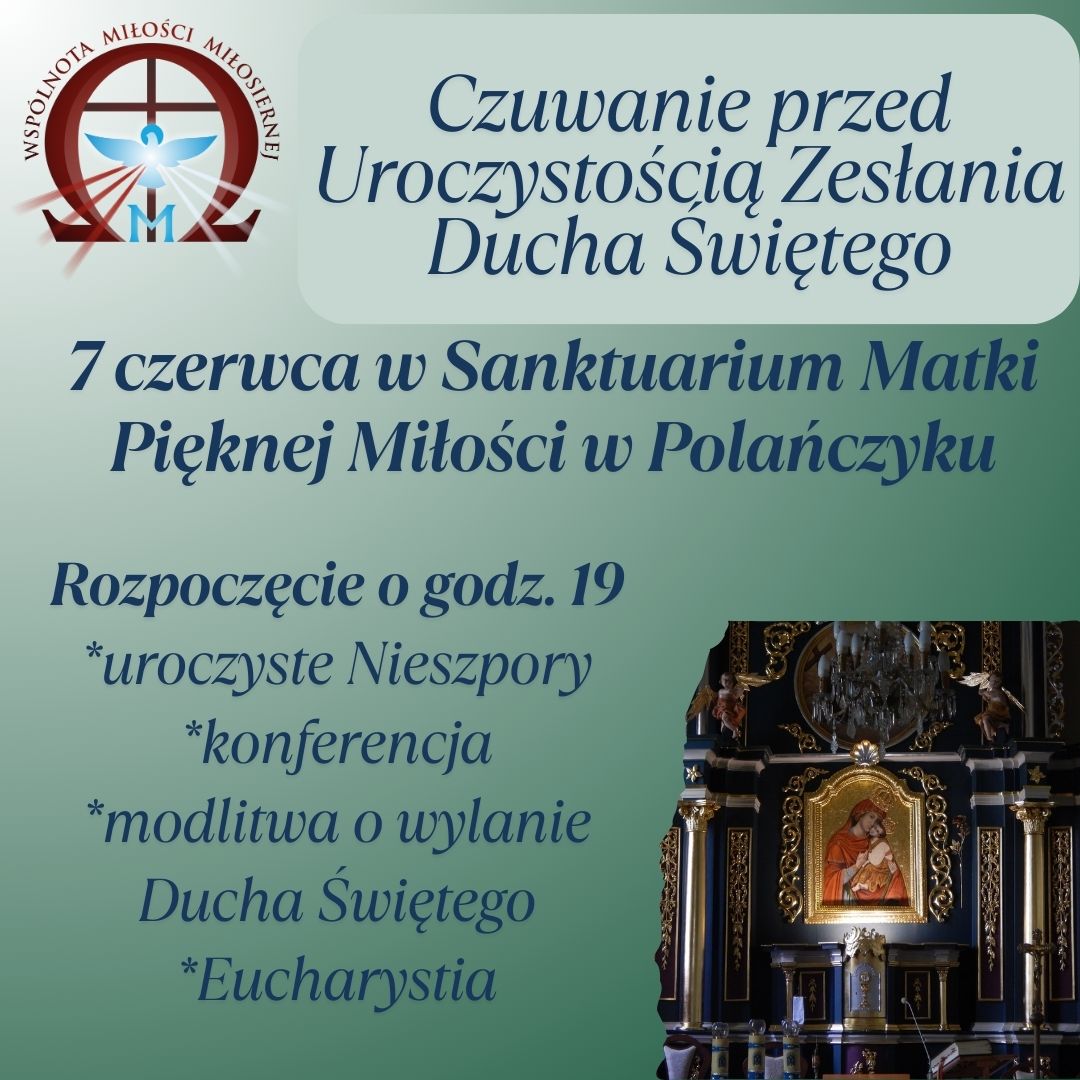 Zaczynamy o godzinie 19.00 w Sanktuarium Matki Pięknej Miłości w Polańczyku Nieszpory Konferencja Modlitwa o wylanie Ducha Świętego Eucharystia