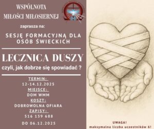 Zapraszamy na weekend formacyjny dla osób świeckich- Lecznica Duszy, czyli jak dobrze się spowiadać. Dodatkowy termin 12-14.12.25. Zapisy: 516 139 688
